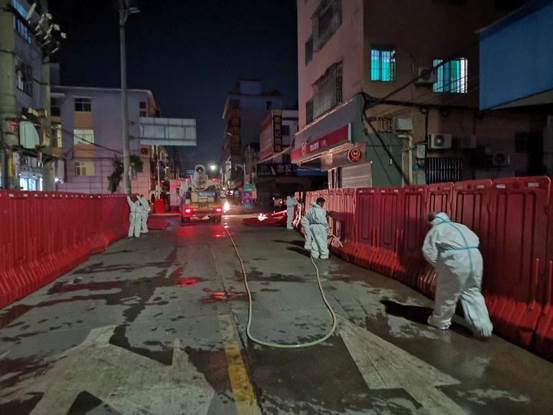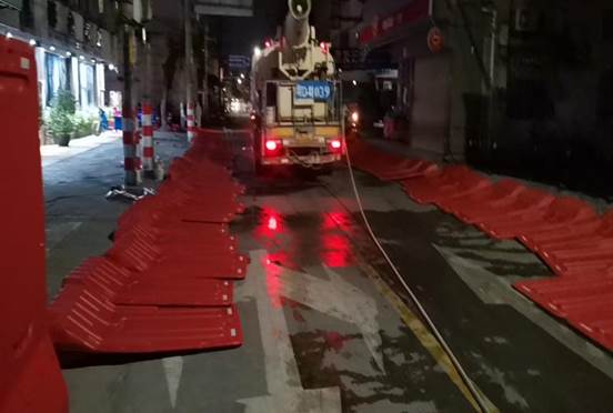 我项目组织相关人员机械,按照交通局的工作部署对疫情防控区域进行水马围蔽,从凌晨到清晨,连续奋战。