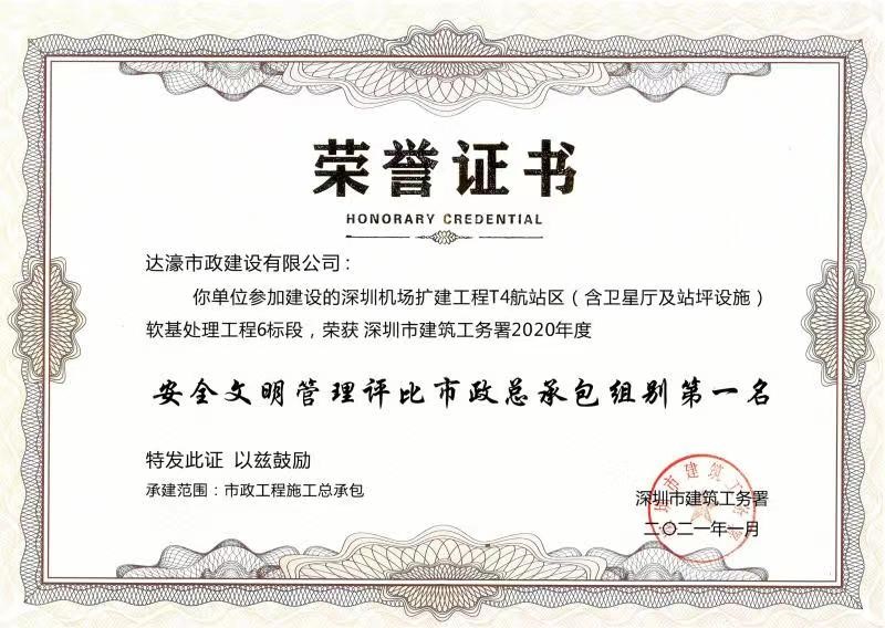 深圳机场T4航站区软基处理工程6标荣获质量评比和安全文明管理评比两个第一名