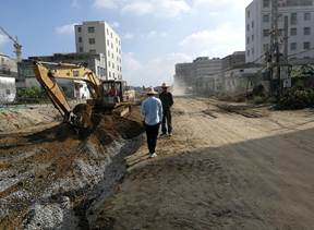 对于闭水实验不成功的检查井,有时也不惜返工重做;对明挖管道进行钢板桩支护,对较深的区域打拉森钢板桩支护;施工进度层层推进,施工员、安全员,队长及各级负责人每天走动管理,跟踪督促施工状况,确保各项目作业点质量到位;作业过程中,及时清理路面碎石,还不时的采用洒水车进行洒水抑制扬尘;大家顶着烈日,有的制作井盖,有的切割钢筋,有的焊接,有的装运,有的浇灌铺设,