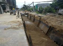 地下管线复杂,项目部和一队人员一道,上下齐心,群策群力,按照安全文明施工方案及要求,对地各种管线(煤气管、水管、通讯电缆)进行探测,采取防护及安全措施。不安全不施工,施工必须安全。宁川北路施工场地狭窄,采用明挖施工作业,地下有多根110kv电缆,还有电信、移动、铁通等纵横交错的管线,为了确保安全,达濠市政公司安全部经理杨衡带人进行现场查看,帮助项目部进行技术分析,并召开安全措施分析会,最终促成修改施工方案,改道作业。